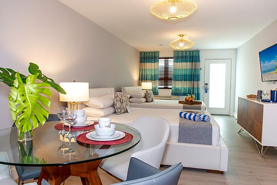 Se admiten mascotas, con posibles cargos. La piscina exterior está disponible toda la temporada y ofrece un ambiente solo para adultos para una escena junto a la piscina más tranquila. Tumbonas y sillas de playa bordean la orilla, y la propiedad ofrece detalles prácticos como menaje de cocina, minicocina, artículos de aseo gratuitos y una bañera para simplificar las rutinas después de la arena.